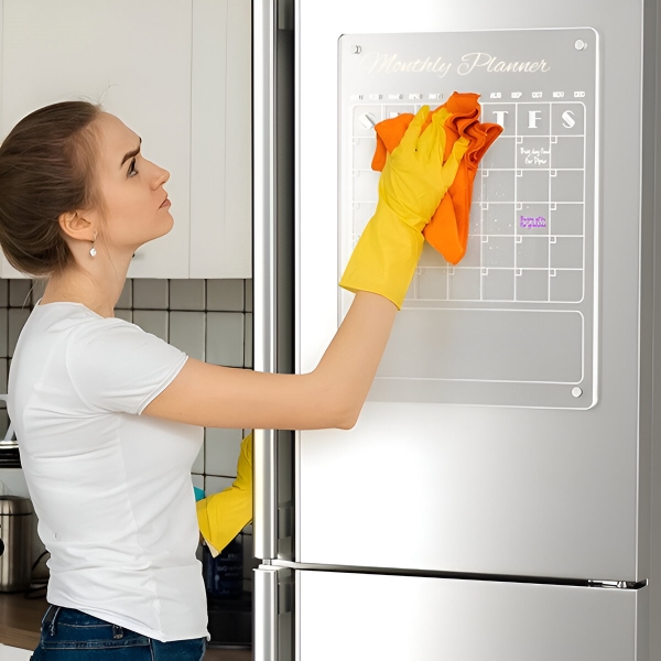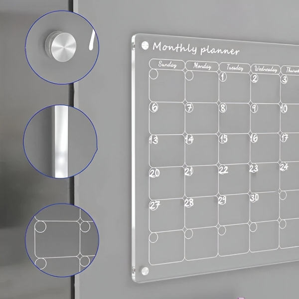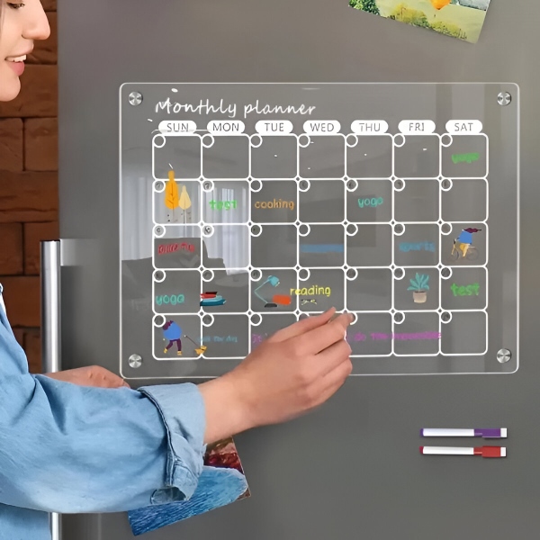 Papírové plánovače se po měsíci vyčerpají a letí rovnou do koše. Čirá akrylová plocha se zcela otře dočista během několika sekund pomocí přiloženého hadříku – žádné stopy, žádné skvrny, žádné zbytky. Povrch je odolný vůči poškrábání a skvrnám, takže zůstává křišťálově čistý i po stovkách smazání.